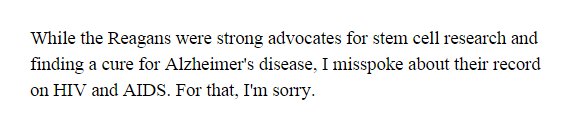 At 4:24 p.m. Eastern on Friday, Clinton issued this statement on her comments: "While the Reagans were strong advocates for stem cell research and finding a cure for Alzheimer's disease, I misspoke about their record on HIV and AIDS. For that, I'm sorry."